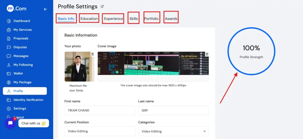 Now you can increase the strength Up to 100% of your profile by providing all the details in your freelance account.